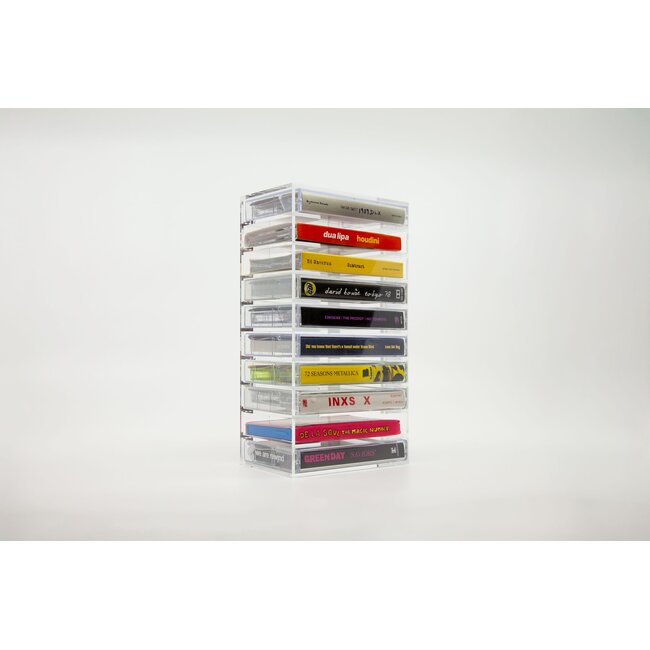 Suporte transparente para organizar e exibir cassetes com estilo moderno e prático. Leia mais.